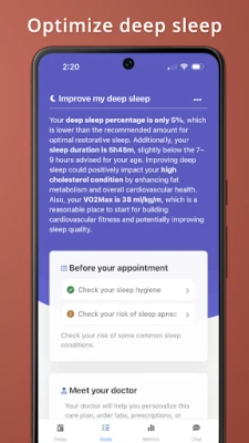Summarize your Fitbit and WearOS vitals into an instant health report. Metrics summarizes 40+ biomarkers into one health score, including resting heart rate, heart rate recovery (cardio recovery), ECGs (electro cardiograms), irregular rhythm notifications, heart attack risk (based on the American College of Cardiology's heart attack risk calculator), HDL cholesterol, LDL cholesterol, ApoB, LP(a), sleep duration, sleep onset, deep sleep, REM sleep, sleep apnea risk, breathing disturbances, oxygen saturation (SpO2), respiratory rate, and VO2 Max (cardio fitness), HRV, temperature, depression, and anxiety. Keep a pulse on your health!