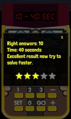 Enter your answer by pushing the number keys. If you're right, the next problem will be presented. If you're wrong, "ERROR" is displayed. You're given two more tries, then the correct answer is displayed. After ten problems, your score - the number of right answers and the time it took to solve, are displayed. A feedback dialog will rate you with 1 to 5 stars. Then another set of ten problems begins with the same operation at the same level.
