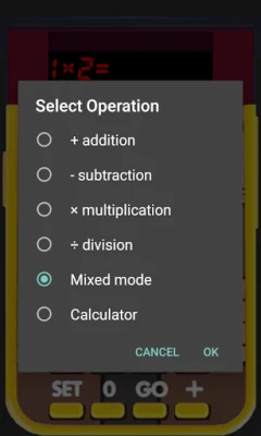 To change the operation: press [SET], then the type [+] [-] [*] [/], or [9] for mixed operation mode. Finally press [GO].