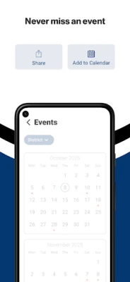 NEVER MISS AN EVENT The event section shows a list of events throughout the district. Users can add an event to their calendar to share the event with friends and family with one tap.
